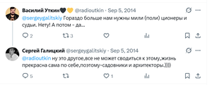 «Нам в стране (по моему мнению), очень нужны архитекторы и садовники. И чем больше, тем лучше!», — написал Галицкий в твиттере.