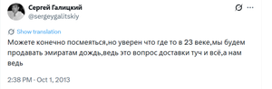 «Можете, конечно, посмеяться, но уверен, что где-то в 23 веке мы будем продавать Эмиратам дождь. Ведь это вопрос доставки туч, и все. А ведь нам дожди надоели», — писал Галицкий в твиттере в 2013 году.