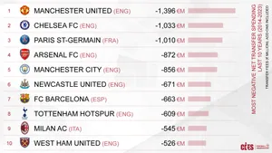 На первом месте в рейтинге оказался «Манчестер Юнайтед», чей трансферный баланс составил -1,398 млрд евро. На втором месте — «Челси» (-1,033 млрд евро), на третьем — «ПСЖ» (-1,01 млрд евро).