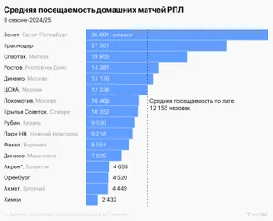 Почти десять лет самым посещаемым клубом страны остается петербургский «Зенит». В минувшем сезоне на домашние матчи клуба собиралось в среднем более 35,5 тысячи человек. Этого достаточно, чтобы уверенно удерживать лидерство по числу болельщиков на трибунах, хотя цифры все еще далеки от пиковых значений 2018 и 2019 годов: тогда на игры «Зенита» в среднем ходило более 48 тысяч человек.