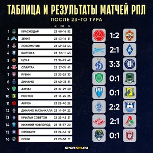 Полностью турнирная таблица РПЛ после 23-го тура выглядит следующим образом: