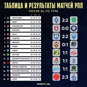 Турнирная таблица РПЛ после 24-го тура: «Зенит» и «Краснодар» продолжают биться за чемпионство
