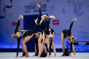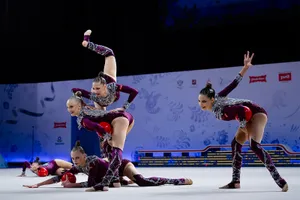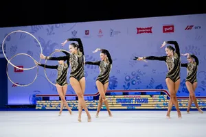 Главной неожиданностью и предметом споров стало золото в многоборье у команды «Небесная Грация». Состав очень молодой, большая часть — бывшие юниорки, что сразу же заметно. В упражнении с тремя обручами и двумя парами булав были серьезные рассинхроны, грязь и неточности. С пятью мячами ситуация обстояла не лучше — начали гимнастки очень хорошо, но после первых же элементов начали путаться, часто спасали ловли, а в финале произошла серьезная ошибка — потеря с пробежкой.