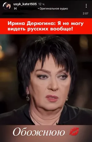 Жена Усика сделала на своей странице в популярной соцсети репост видео с отрывком из недавнего нашумевшего интервью Дерюгиной. Этот отрывок вышел под таким заголовком: «Ирина Дерюгина: Я не могу видеть русских вообще!»