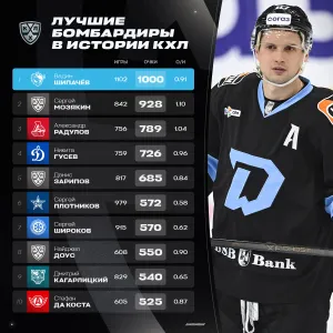 В октябре прошлого года Вадим Шипачев набрал 929-е очко за время выступлений в КХЛ. Центральный нападающий минского «Динамо» катил по правому флангу, увидел нападающего Вадима Мороза, который был в центре, и отдал тому передачу точно на клюшку. Мороз подвести партнёра не мог и послал шайбу в ближний угол ворот. Так он побил рекорд Сергея Мозякина по очкам за историю лиги. А что особенно трогательно — сделал это в родном для себя Череповце.