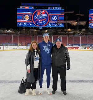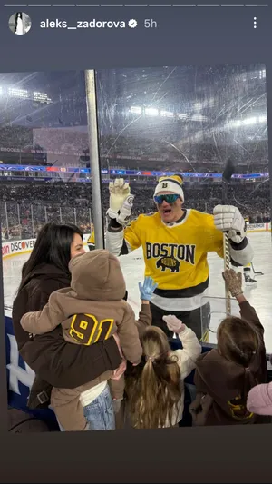 Накануне паузы состоялся также матч стадионной серии между «Тампой» и «Бостоном». Форварда «Брюинз» Марата Хуснутдинова на этом матче приехала поддержать супруга.