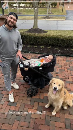 Иван Проворов с близкими тоже много гуляет, а нянчиться с сыном хоккеисту и его супруге Мэдисон помогает домашний питомец, ставший уже настоящим членом семьи — пес Дрейк.