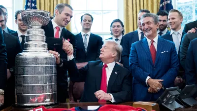 «Мы вам очень благодарны, это большая честь для меня, потому что я фанат хоккея, фанат «Вашингтона» и Алекса Овечкина. У меня не оставалось выбора, только как стать его фанатом, потому что Ови — нечто. Вы только посмотрите на эти руки! Он особенный парень, особенный спортсмен и игрок. Не просто так его зовут Александр Великий. Он очень много работает, забивает больше всех в лиге. Где моя дочь Иванка? Она дружит с Ови, большой фанат его», — говорил Дональд во время визита «Столичных».