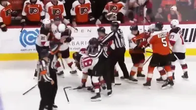 Российские хоккеисты сцепились в конце первого периода при счете 4:1 в пользу «Флайерз». Бывших игроков СКА успокоили одноклубники.