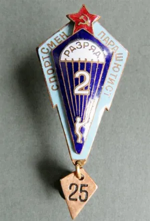 Речь идет о советском спортивном значке «Спортсмен-парашютист». Такие значки выдавались за выполнение нормативов и подтверждали подготовку в парашютном спорте. Система предусматривала несколько разрядов — от начального до более продвинутого уровня.