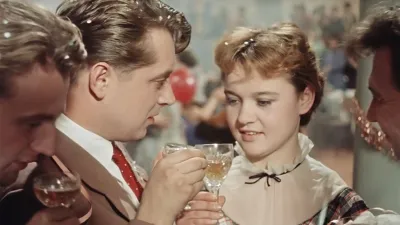 Однако массовым символом Нового года шампанское стало не сразу. Огромную роль в этом сыграл кинематограф. В 1956 году на экраны вышла «Карнавальная ночь» Эльдара Рязанова — фильм, снятый по заказу комитета кинематографии с четкой задачей популяризировать Новый год как светский и коллективный праздник. Картина предлагала зрителям готовый и одобренный государством сценарий торжества: клуб, концертная программа, серпантин, конфетти и, конечно, бокалы с шампанским. В руках Леночки Крыловой игристое вино впервые закрепилось как визуальный и эмоциональный образ безудержного новогоднего веселья.