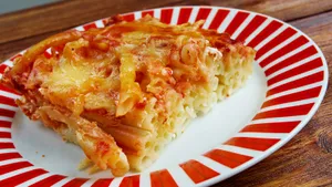 Макаронник представлял собой простую запеканку из отварных макарон с молочно-яичной заливкой. Его запекали до легкой румяной корочки и подавали теплым — чаще всего на завтрак или полдник.