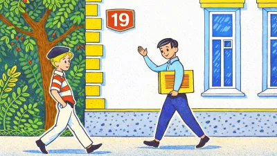Степа - это мальчик в кепке. Он идет в сторону дома "19" (внимательно посмотрите на стену здания). Если идти от первого дома, то дома с нечетными номерами будут на левой стороне. Следовательно, именно этот мальчик идет по направлению к дому "23".