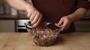 - Приготовьте заправку: в отдельной емкости смешайте яблочный уксус и растительное масло (примерно 1 ст. л. уксуса + ~2 ст. л. масла) и слегка взбейте. Затем залейте салат заправкой и осторожно перемешайте.