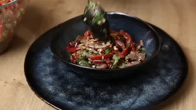 - В глубокой миске соедините мясо, фасоль, перец, лук, чеснок, орехи, зелень. Посолите и поперчите.