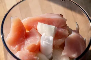 1. Куриное филе тщательно промойте, просушите бумажными полотенцами и нарежьте небольшими кусочками. Измельчите филе в блендере или пропустите через мясорубку с самой мелкой решеткой, чтобы добиться максимально однородной и пастообразной массы.