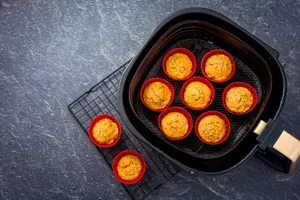 - Выложите готовое тесто в формочки для кексов и поставьте их в аэрогриль — готовьте 15–20 минут при 170°С.
