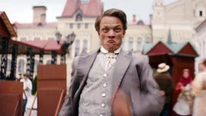 Злодеев в фильме еще больше, чем иронии над буржуазными нравами. Пока герои пытаются добраться из Москвы в Нижний Новгород, за ними по пятам следует троица глуповатых бандитов, «хозяева» Волчка, хитрая охотница за людьми Эльза и безжалостный дядюшка. Поэтому ни у главных героев, ни у зрителей по ту сторону экрана расслабиться не получится — опасность поджидает в любой провинциальной гостинице или в самом центре шумной ярмарки. К финальной части от количества сюжетных коллизий, неожиданных стычек и эмоциональных горок у меня слегка закружилась голова. Не помешало бы добавить парочку дополнительных сцен для передышки, но по большей части это вкусовщина и личное восприятие. Для целевой аудитории фильма, выросшей в ритме ТикТока, подобный темп уже давно стал обыденностью.