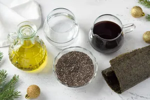 - Семена чиа залейте водой и перемешайте. Туда же добавьте измельченные водоросли и соевый соус. Еще раз перемешайте и оставьте минимум на 30–40 минут, а лучше дольше. За это время семена набухнут и приобретут нужную текстуру.