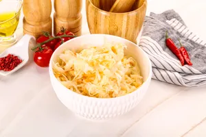 4. Квашеную капусту отожмите (если она слишком кислая или соленая, ее можно немного промыть), а затем нарежьте, чтобы она не была слишком длинной.