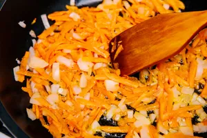 3. В сковороде разогрейте 2 столовые ложки растительного масла и обжарьте на нем лук до полупрозрачного цвета, а потом добавьте морковь и пассеруйте их вместе до мягкости. Далее добавьте томатную пасту и сахар — перемешайте и уберите с огня.