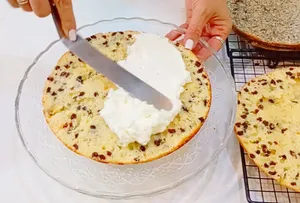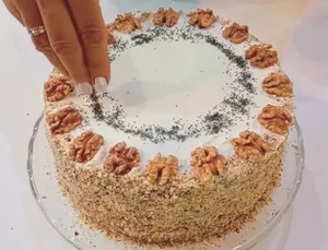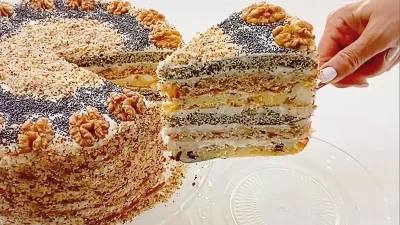 Промазывать коржи кремом, чередуя вкусы. Обычно начинают с коржа с изюмом, затем ореховый, затем маковый.