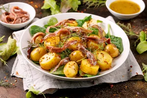 Шпроты уже содержат масло и соль, поэтому салат не требует обилия соусов. В классическом варианте используется минимальное количество майонеза или более легкая заправка — это позволяет сохранить вкус рыбы и не сделать блюдо слишком жирным. Такой подход рекомендуют и диетологи: использовать шпроты как акцент, а не как доминирующий по калорийности ингредиент.