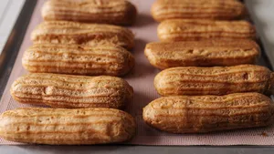 Второй важный момент — стабильная температура выпекания. Открывать духовку до 20–25 минуты нельзя: эклеры осядут и уже не поднимутся. В конце можно слегка приоткрыть дверцу, чтобы корочка подсохла.