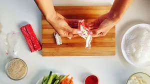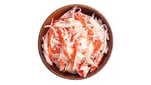 Важно понимать, что крабовые палочки — это не «краб» в классическом смысле, а продукт на основе сурими. Сурими делают из измельченного рыбного филе (чаще всего белой океанической рыбы), к которому добавляют соль, воду и стабилизирующие компоненты. В результате получается пластичная масса с нейтральным вкусом, которая легко принимает нужную форму. Эта особенность делает продукт удобным для кулинарных экспериментов: он хорошо связывается с другими ингредиентами и не требует длительной термической обработки.