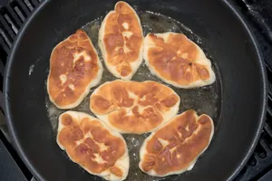- Жарить пирожки на среднем огне до румяной корочки с двух сторон, чтобы начинка прогрелась, а тесто прожарилось равномерно.