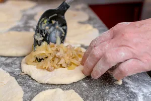 Такие пирожки можно приготовить с картофельным пюре и жареным луком, картошкой и грибами, яйцом и зеленым луком, повидлом, яблоками с сахаром. Для сладких начинок в тесто обычно добавляют чуть больше сахара, но сама структура остается той же — мягкой и податливой.