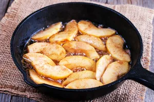 - Выложить на разогретую сковороду, добавить сахар и корицу, прогреть 5–7 минут до мягкости.