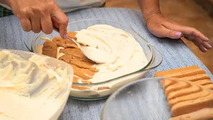 5. Следующим слоем снова должно быть печенье, а потом вторая часть крема.
