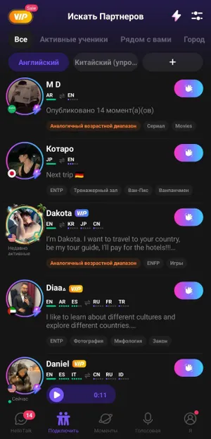Идеальный вариант для тех, кто хочет не только найти новых знакомых, но и прокачать свой уровень владения иностранными языками. Приложение позволяет общаться с носителями, изучающими русский, и обмениваться своими знаниями. При регистрации необходимо указать уровень владения языками, а также основные данные о себе, своих интересах и местах, в которых вы хотели бы побывать. После этого система начнет подбирать пользователей из разных стран в соответствии с вашим уровнем владения языком, возрастом и увлечениями для комфортного и продуктивного общения. Приложение также позволяет выкладывать публикации на своей странице и прослушивать обучающие курсы.