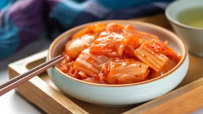 Кимчи (кимчхи)— это ферментированные овощи (в основе чаще всего пекинская капуста), приготовленные с добавлением соли, чеснока, имбиря, перца чили, зеленого лука и иногда рыбного соуса. Вариаций блюда существует множество: используются редька, огурцы, баклажаны и даже морепродукты. Но главной особенностью всегда остается процесс ферментации, благодаря которому продукт приобретает характерный кисло-острый вкус и насыщается полезными веществами.