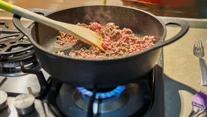 3. К луку добавьте мясной фарш — обжаривайте вместе, разбивая комочки лопаткой, пока мясо не изменит цвет и не испарится лишняя жидкость.