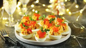 - Наполните белки начинкой и украсьте икрой при подаче.