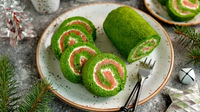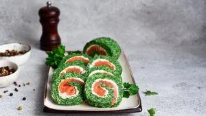Простая закуска для праздничного стола: рецепт шпинатного рулета с красной рыбой и творожным сыром