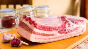 Успех засолки на 80% зависит от качества и части выбранного сала. Лучше всего подходит боковина (грудинка свинины): имеет красивые мясные прослойки (чередование сала и мяса).