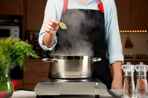 4. В сотейник налейте воду и поставьте ее на огонь. Как только она закипит, всыпьте соль, опустите лавровый лист и перец горошком. Дождитесь полного растворения соли и сразу же снимите с огня. Дайте рассолу остыть в течение 5 минут.