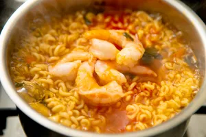 Лапша быстрого приготовления с креветками на сковороде