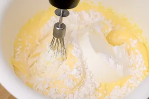 2. Белки взбейте отдельно с щепоткой соли до мягких белых пиков — именно они отвечают за воздушную текстуру. После чего аккуратно соедините белки с творожной массой, двигаясь снизу вверх, чтобы сохранить структуру.