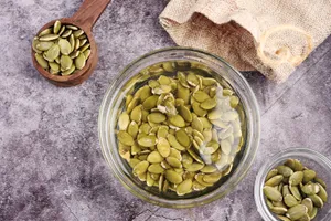 1. Возьмите 3 столовые ложки сырых очищенных семян тыквы, хорошо промойте и замочите их в 250 миллилитрах воды на 6–8 часов (удобно это делать с вечера — утром они будут готовы к измельчению).