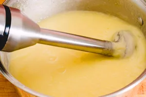 5. Когда горох сварится, добавьте к нему зажарку со специями, влейте кокосовые сливки и пробейте массу погружным блендером. Если вы не любите горох в виде пюре, можно просто размять его лопаткой до желаемой текстуры.