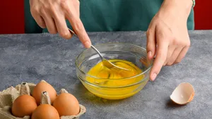 2. Яйцо слегка взбейте с солью и специями с помощью вилки.