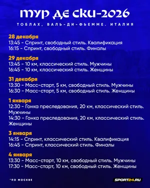 «Тур де Ски» пройдет в Италии с 28 декабря 2025 года по 4 января 2026-го. Норвежец Йоханнес Клебо будет защищать прошлогодний титул, а у женщин будет новая чемпионка, так как Тереза Йохауг окончательно завершила карьеру.