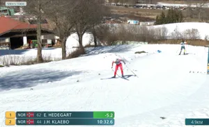 Эйнар Хедегарт хорошо стартовал — лидирует и на 1,7 км, и на 3,4 км.