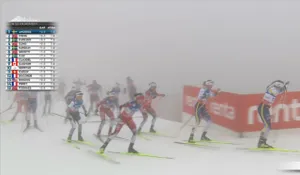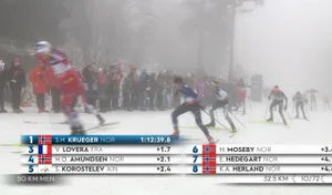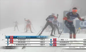 За два круга до финиша Савелий и другие лидеры поменяли лыжи. Этим воспользовался Ивер Андерсен, наблюдаем его побег.