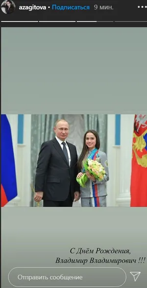 Российская фигуристка Алина Загитова поздравила президента России Владимира Путина с днем рождения. Олимпийская чемпионка выложила фото с главой государства в сторис инстаграма. В среду, 7 октября, Путину исполнилось 68 лет.