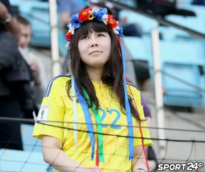 Родом из Украины. Ну, или у нее просто футболка характерная. Такая девушка смотрела на матч «Динамо» с «Рубином». Он явно уступал по красоте барышне.